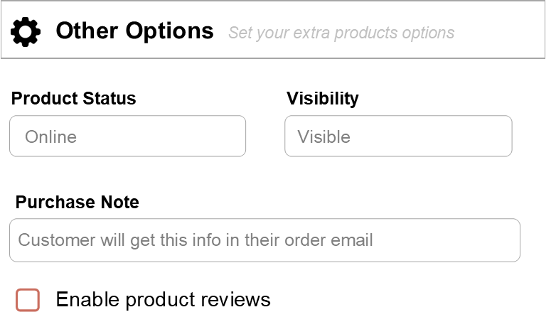 This section includes additional settings that control how your product appears in your store. These options may allow you to enable product reviews, add a purchase note, or change the product visibility.